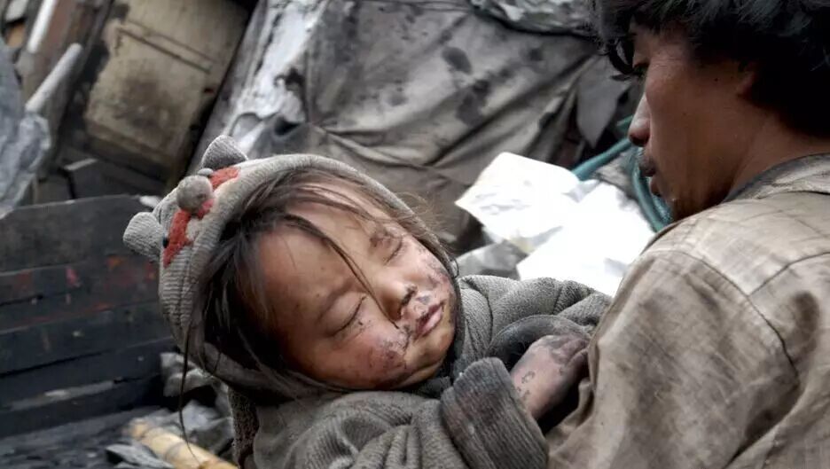 一位父亲将在煤炭上睡着的孩子送去窝棚睡觉。