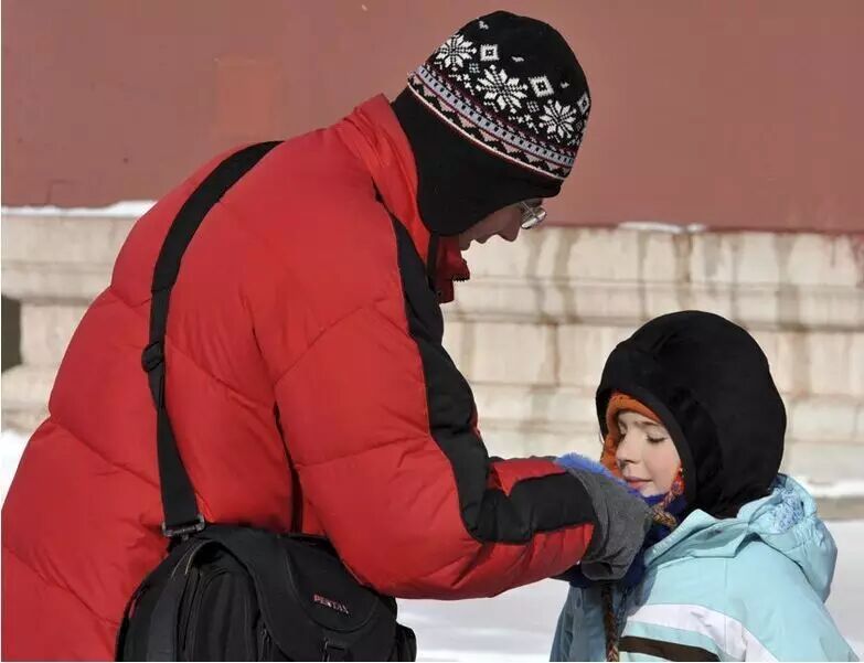 北京,天安门前游玩的一位外国父亲将儿子的围巾又扎紧了一些,以防灌入寒风。