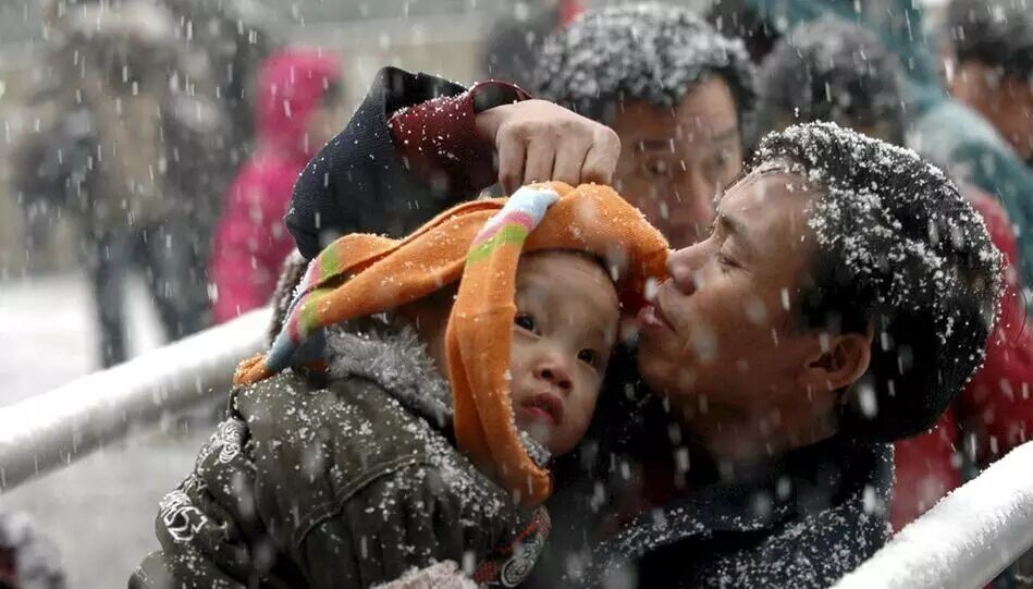 郑州火车站进站的人流中, 一位父亲为怀抱中的孩子裹紧围巾 。