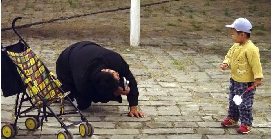 一位父亲趴在地上,为自己的孩子留影。