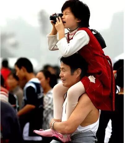 十一的天安门广场上人山人海,一父亲把女儿背在肩膀上,好让女儿照到更多景色。