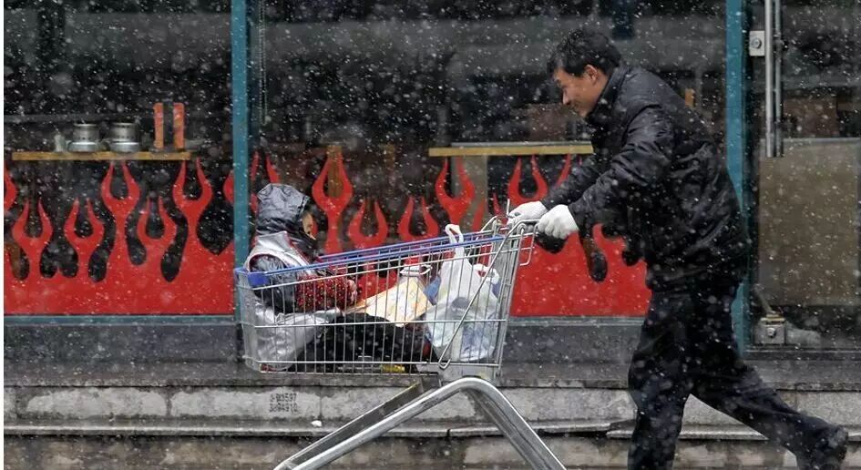 上海某超市,一位父亲正推着购物车上的孩子在雪中赶往停车点。