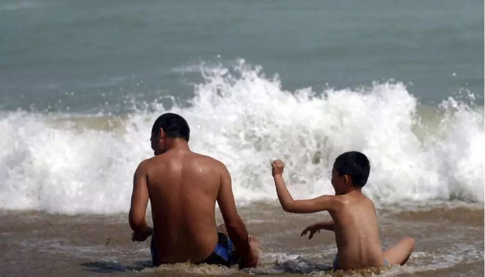 海南琼海,一对父子在博鳌海滨戏水。