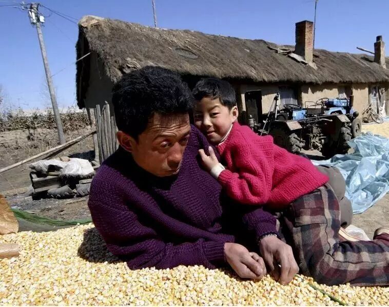 东北农村民居粮堆上休息的父女俩。