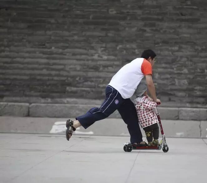 西安小南门,2岁的然然握着滑板车把手,爸爸在后边帮忙提供“动力”,父子俩乐融融的一幕让路人也感受到温馨和幸福。