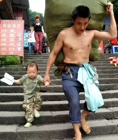 重庆市朝天门批发市场,扛着一大包货物的父亲一只手抓住货物,一只手紧紧牵着儿子从梯坎走下。这名父亲是一名城市力工,在批发市场扛货物为生。