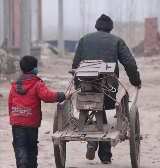 河南省安阳市汤阴县菜园镇,一名小学生帮着父亲推一辆载着重物的木板车,为父亲减负。