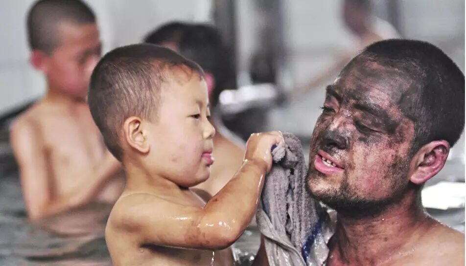 山西焦煤集团汾西矿业新峪公司,一位矿工的儿子为爸爸洗脸。