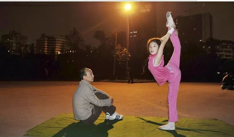 成都,父亲陪着姚启凤在路灯下练习芭蕾。小女孩每做一个动作,父亲都为她加油鼓劲。