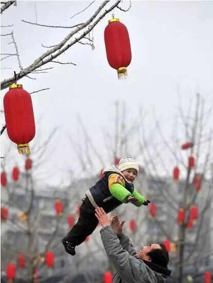 武昌光谷广场外,一父亲将孩子抛向空中,四周的树枝上挂满了喜庆的红灯笼。