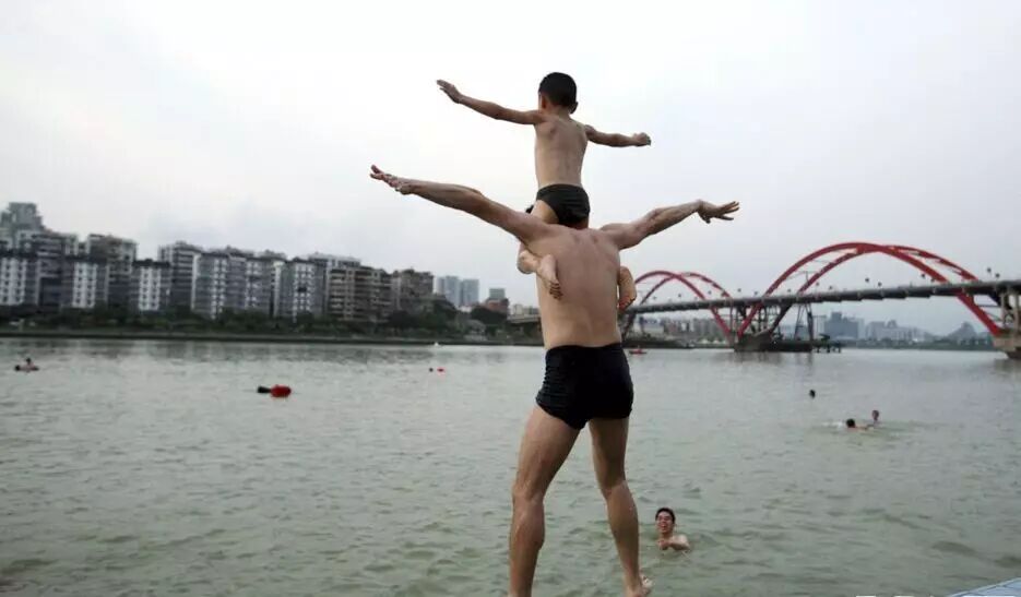 广西柳州,6岁的小孩骑在父亲的肩膀上跳进柳江河里游泳。
