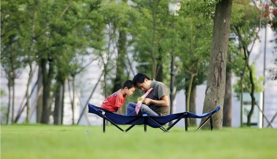 重庆江北城中央公园,一位父亲坐在休闲床上为孩子修理玩具。