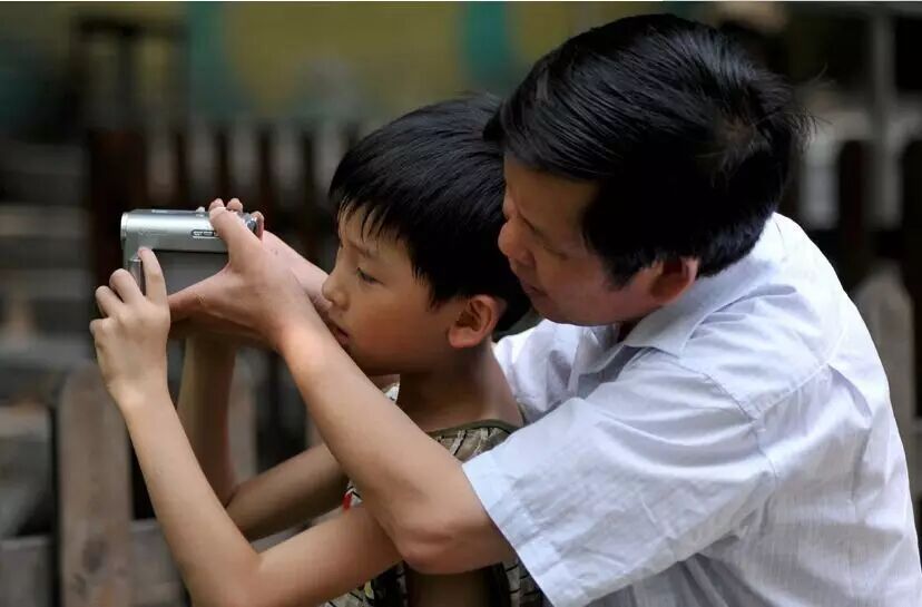 北京动物园,一位父亲正在手把手教孩子摄像。