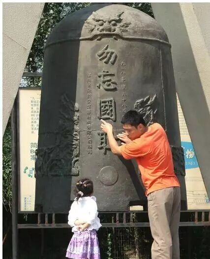 一年轻的父亲在沈阳“九一八”历史博物馆警示钟前为女儿讲解“九一八事变”的经过。