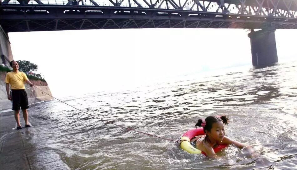 武汉,傍晚,8岁的刘沐欣在父亲的带领下,套上带绳的游泳圈,在长江边游泳