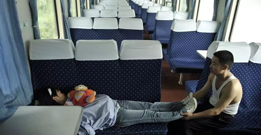 在列车上,一位父亲为让女儿有个舒适的睡姿,一直抱着女儿的腿。