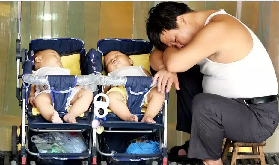江城武汉闷热难耐,一商场内门口,一位父亲和一对双胞胎婴儿在店内吹出的凉气下酣然入睡。