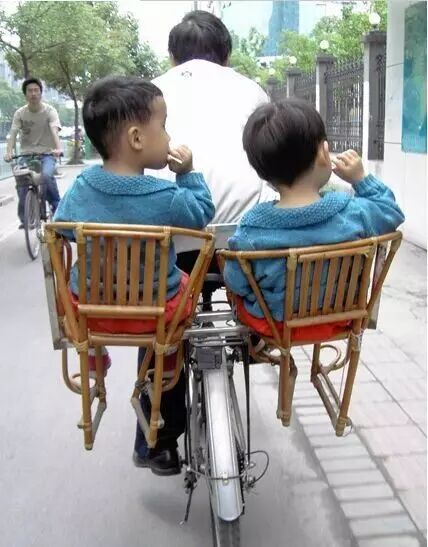 杭州,父亲用改装过的自行车送自己的一对双胞胎儿子去幼儿园。