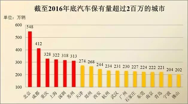全国有49个城市的汽车保有量超过百万辆,18个城市超200万辆,6个城市超300万辆。其中汽车保有量超过200万辆的18个城市依次是北京、成都、重庆、上海、深圳、苏州、天津、郑州、西安、杭州、武汉、广州、石家庄、东莞、南京、青岛、宁波、佛山。