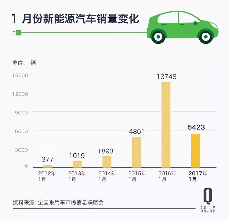 经过这几年的发展,国家补贴的“新能源”这个名录里面可选的车型已经越来越多。但是,1 月份同比大跌 61% 的销量证明,这还是一个政策驱动,而非消费驱动的市场。