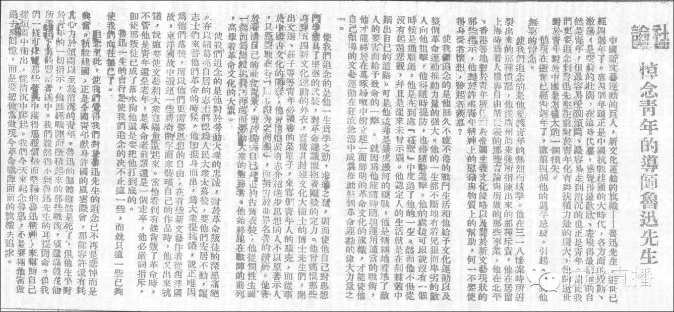 追念至此,使我们觉得我们对于鲁迅先生的追念已不再是悲悼而是兴奋。,正是全国青年献身许国的风云际会,那能容许还有耗其心力于烦闷以至于消极的青年。鲁迅的躯体虽然是死了,但他生平对于青年的一切指示,他历经战阵而累积起来的那些战术,原还满载在他所遗留下来的丰富著述中。我们虽然得不到鲁迅先生的耳提面命,但我们一样可以从那些著述中获得那种倔强而坚韧的鲁迅精神,来帮助自己从烦闷中冲出,从消极中爬起。我们今天来纪念鲁迅,不是要把他当作过去来回忆,而是要把他当作现今革命战阵面前的旗帜去追求。