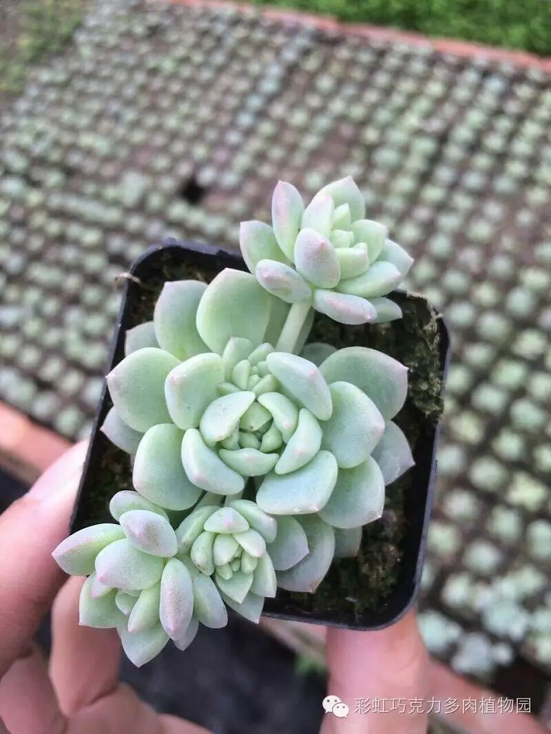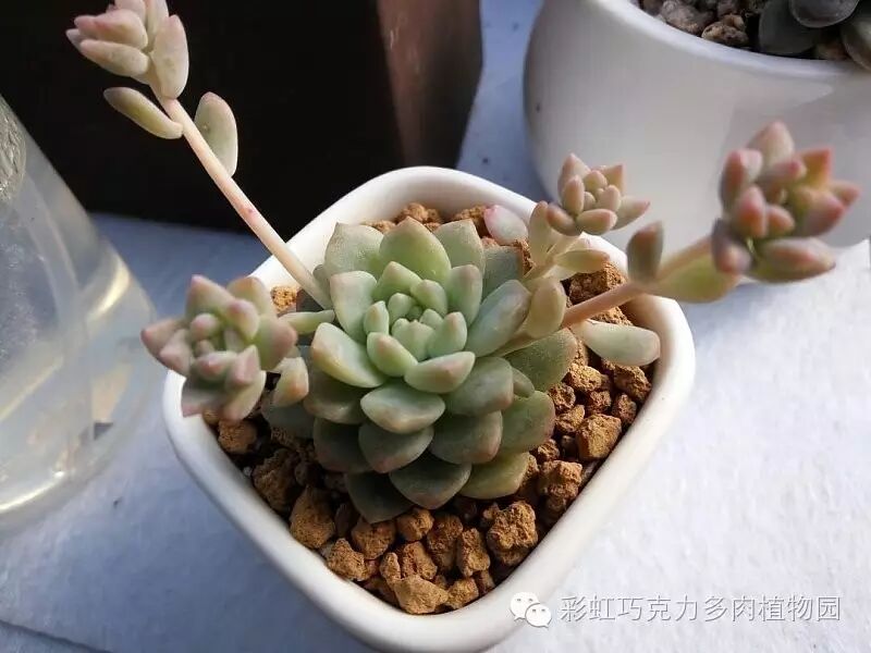 相貌特征:子持白莲的叶片排列成小莲座状,叶片表面有淡淡的白粉,叶尖在阳光下会出现漂亮的粉红,冬季温差大叶片也会微微泛红。子持白莲会象子持莲华一样从母株的叶下长出很多的侧枝,侧枝生长比较迅速,群生的子持白莲看起来有点杂乱无章。虽然是微型的品种,一旦群生起来也是很大的。
