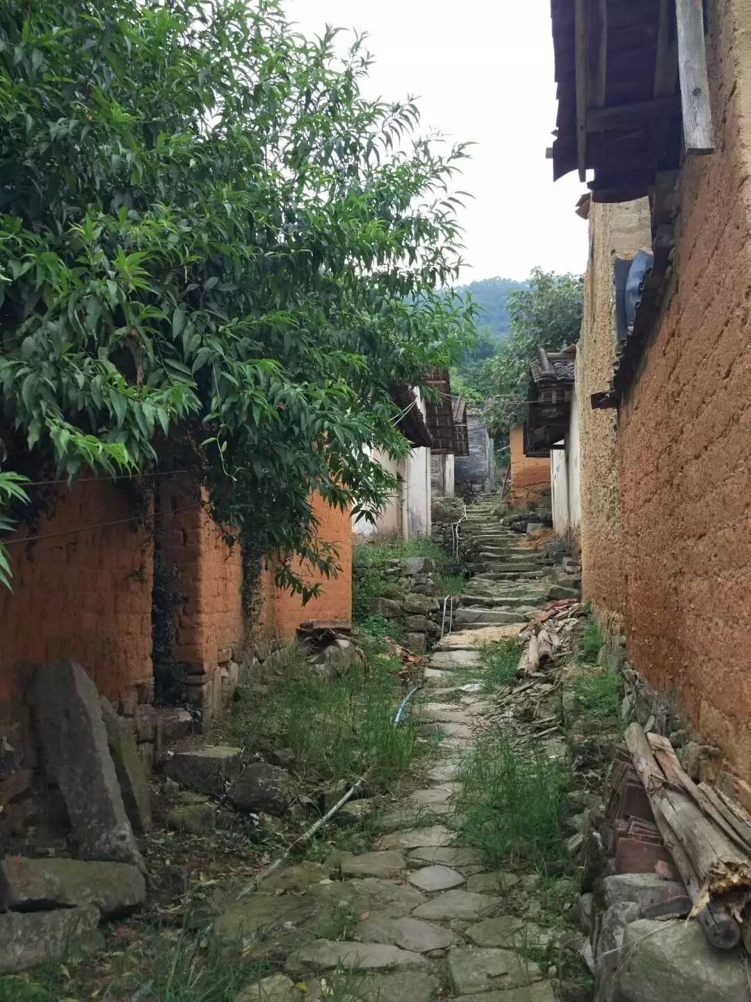 沿着石头阶梯往上走,风从山上跑来,带来一阵凉意。在这条上百年石头路的两边错落着用泥土禾草砌的房子,炎热的太阳正在抽取房子释放的咸气。屋檐更换以后,从前储水的四方槽还安放在天井里,只是过往蓄积的水已被苔藓和小草接收,在角落伸展着一些青绿。