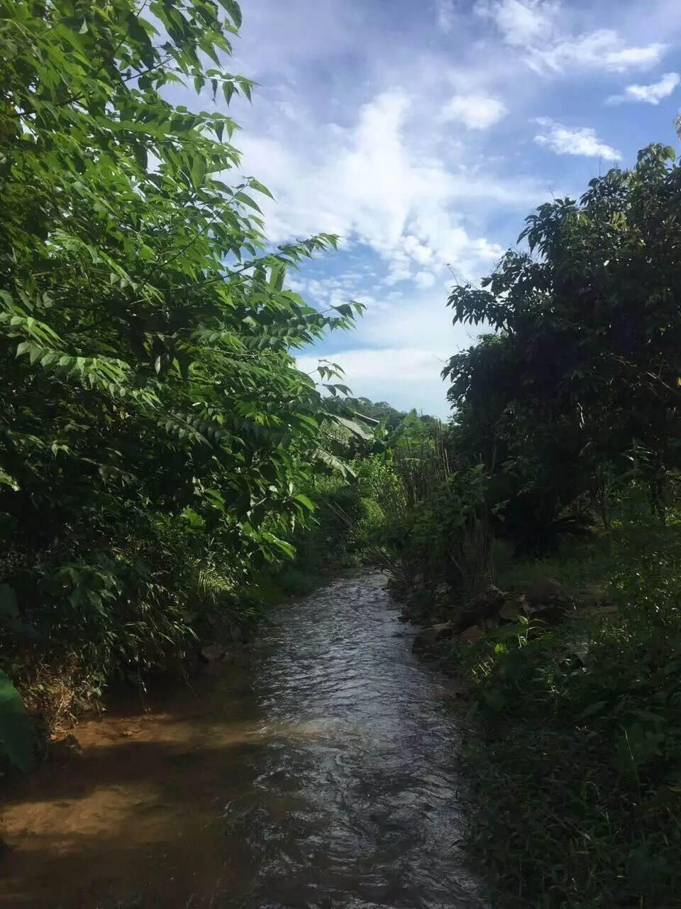 走进田里,水环绕在田中,平静而缓慢,时而躲在水池里,时而藏在花洒中,时而留在田埂里,然后葉开始舒展,花开始绽放,藤蔓开始被渐长的瓜果拉伸,茄瓜、秋葵、冬瓜、南瓜、通心菜、芥菜……都在咕咚咕咚吸水长大;水环绕在田中,溪流环绕在田边欢唱,溯溪而上,溪水波浪般随着河床的高低穿过脚边,细沙也随着水的浪涛飘摇。