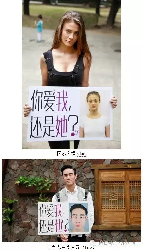 在“你爱我还是她”事件爆红和引发热议之下,一群同样有着整形经历的男女,纷纷模仿“你爱我还是她”的艺术形式,在广州各大地标前举起“你爱我还是她/他”的牌子,晒出自己一直不敢公之于众的“整形前”照片,以行动来支持对“颜值”价值观的大拷问。