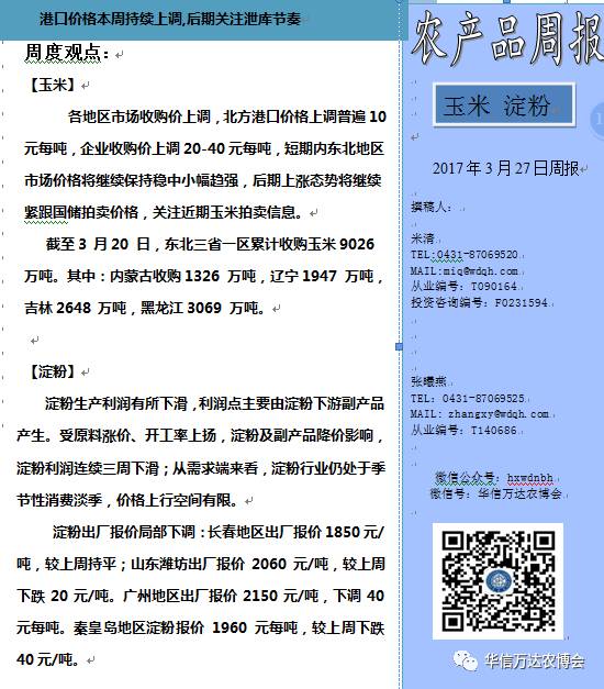 淀粉出厂报价局部下调:长春地区出厂报价1850元/吨,较上周持平;山东潍坊出厂报价2060元/吨,较上周下跌20元/吨。广州地区出厂报价2150元/吨,下调40元每吨。秦皇岛地区淀粉报价1960元每吨,较上周下跌40元/吨。