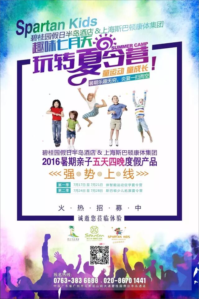 【夏令营时间安排】第一季:7月17日-7月21日 第二季:7月24日-7月28日 【收费标准】推广价:RMB3980元/人 体验价:RMB2888元/人;RMB4688元/家庭(一大一小,家长可以陪同小孩一起吃住,安排同一房间,但不与小孩参加夏令营。) 【活动地点】碧桂园假日半岛 【报名热线】0763-383 6688/020-8670 1441