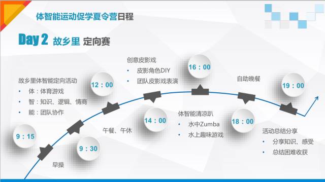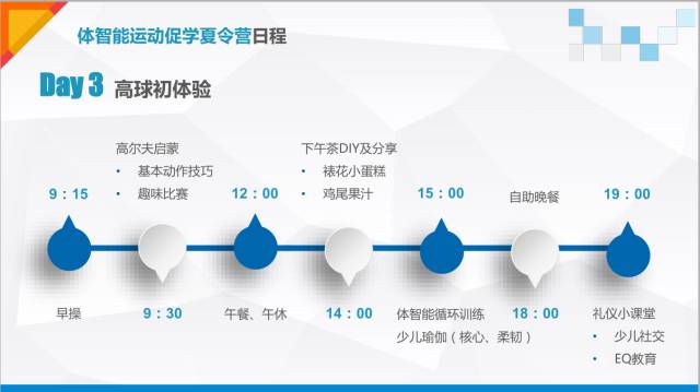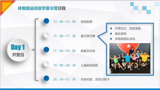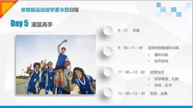 体智能运动促学夏令营 (7月17日-7月21日) 少儿体智能训练,以体智能和儿童感训练原理为基础,围绕青少儿核心、耐力、柔韧、心肺、平衡五大训练目标,同时加入逻辑思维训练元素,利用多样化教具,设计出一套循序渐进的青少儿专属体能训练课程体系 体智能运动促学夏令营通过多元训练,搭配团队游戏、情商课堂,提升儿童身体素质、思维发展、品德教育等综合素质,不仅强调儿童体能和技能,更锻炼儿童的动手、动脑能力,培养儿童坚强、独立自主的品质和良好的团队合作意识,引导儿童树立敢面对困难和战胜困难的自信心。