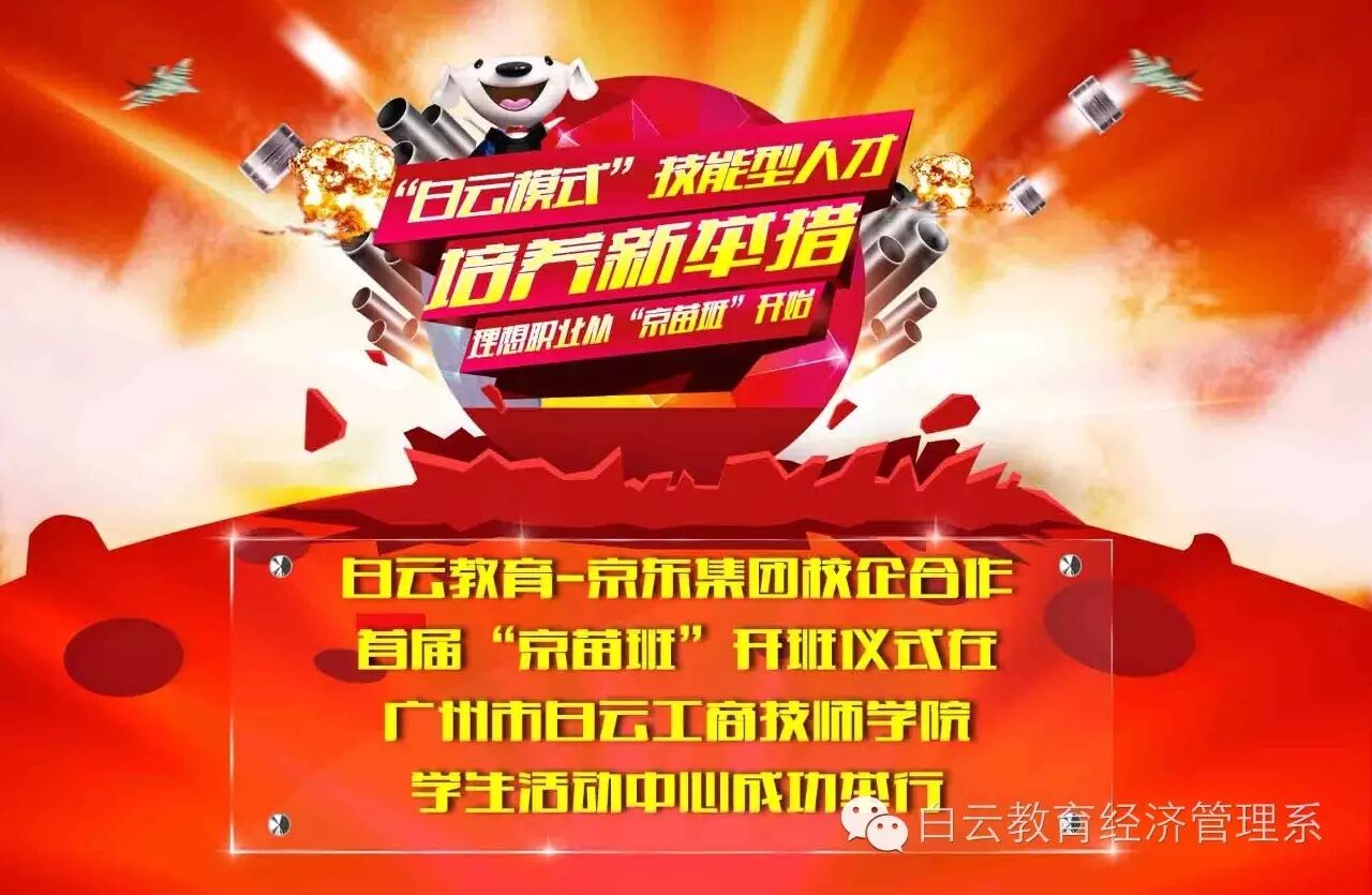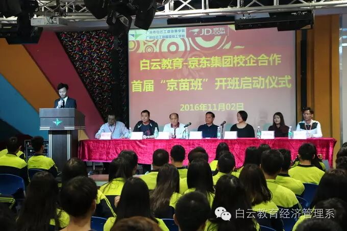11月2日上午,白云教育-京东集团校企合作首届“京苗班”开班仪式在广州市白云工商技师学院学生活动中心成功举行。乔本新副校长出席开班仪式,并宣布白云教育集团首届“京苗班”正式启动。