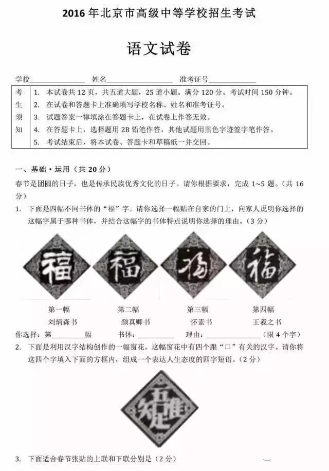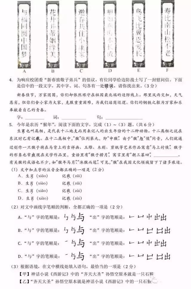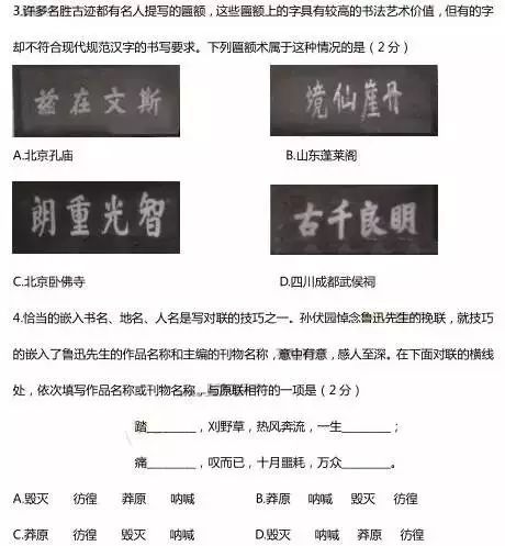 一起来看一看近几年出现在中高考试卷中和书法有关等试题: