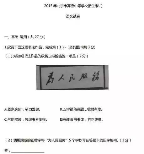 在2016年公务员考试的《行政职业能力测验》和《申论》中,就包括了大量有关书法方面的知识内容。书法试题不仅仅在中、高考试中出现,而且进入了国考。