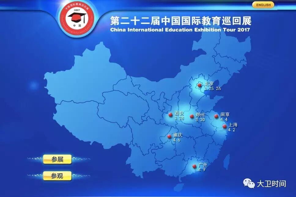 『大卫时间』消息,2017(第二十二届)中国国际教育巡回展将于3月25日至4月9日在北京、西安、郑州、上海、南京、重庆、广州举行。