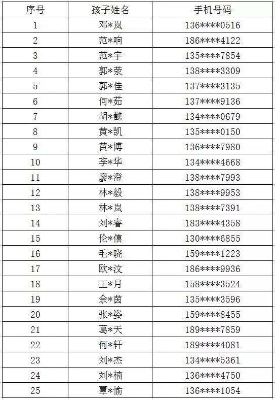 大家好!以下是“创意体适能游戏工作坊(幼儿班)”的入选名单。今天内我们会将报名成功的短信和邮件发给各位家长,请家长们留意查收,若因网络因素影响部分家长未能收到短信,以下面公布信息为准。