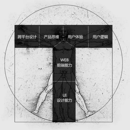 「互联网+UI」是“互联网+”大背景下对UI设计师能力要求的升级,即T型人才。T字的一竖代表深度,即UI设计能力与WEB前端能力;一横代表在不同行业的跨界融合能力。