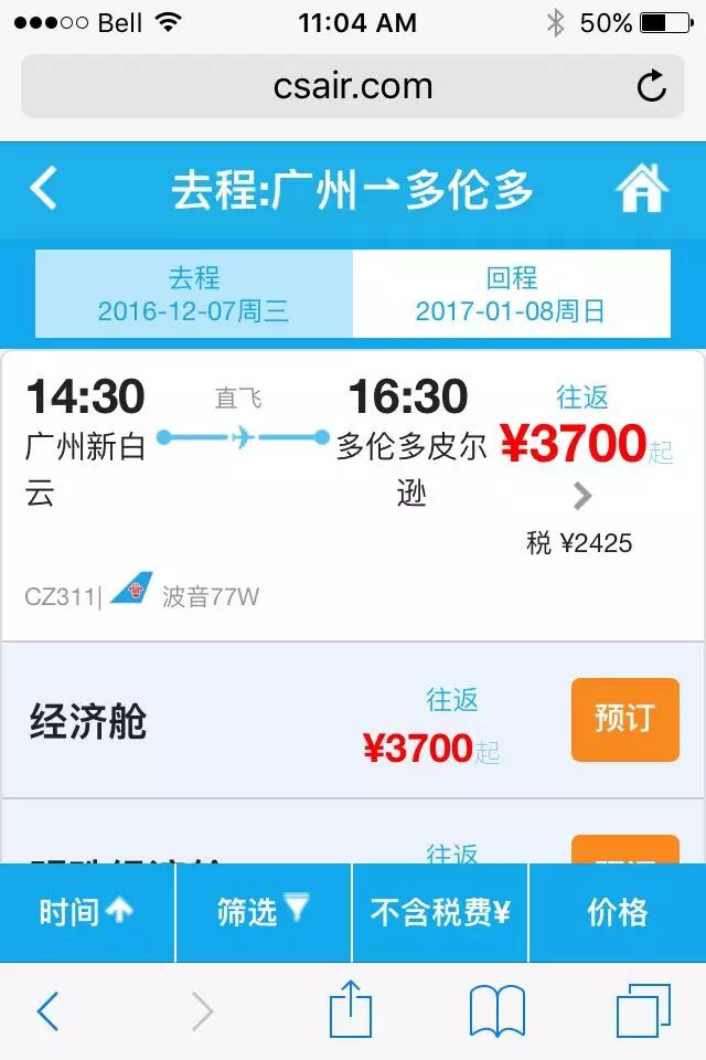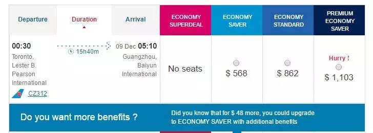 不过,在订票的页面发现,12月8日第一趟从多伦多直飞广州的经济舱已经售卖完毕,昨天才公布,今天就卖光,看来多伦多直飞广州的市场潜力很大啊。