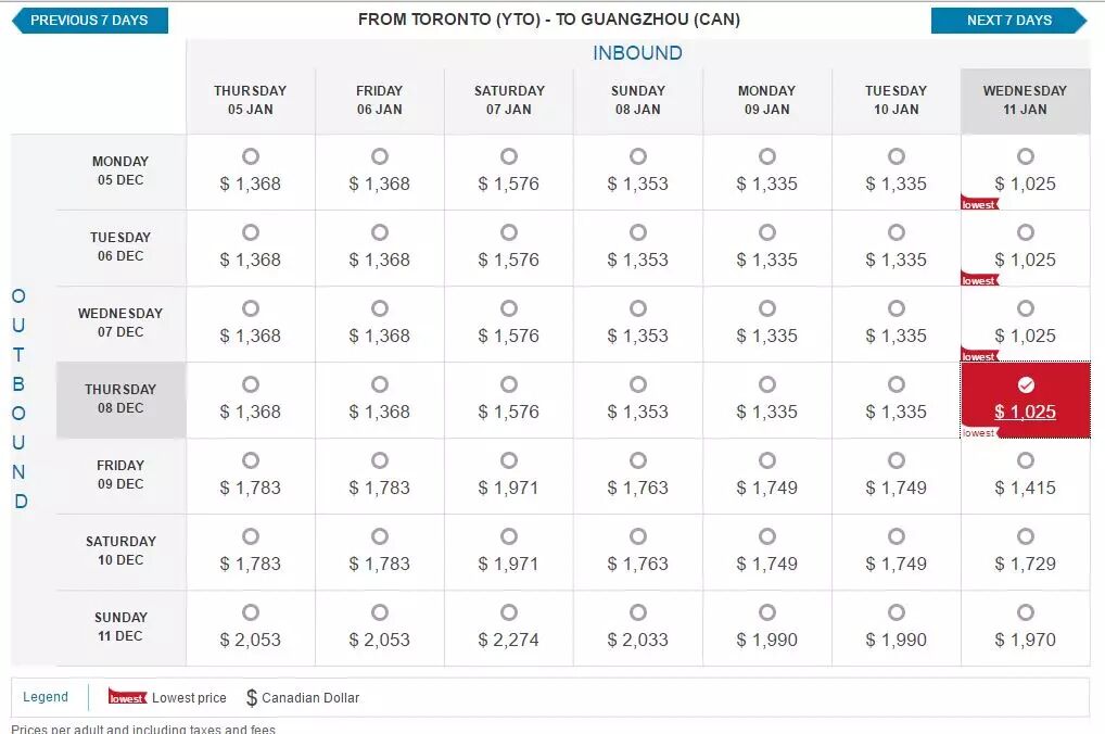 如果从南航加拿大网查询票价,多伦多往返广州的含税票价最低是1025加元。