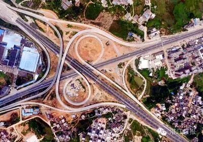 纵观足下的互通立交呈几乎对称的苜蓿叶型,四通八达,桥道高低起伏、错落有致,绿化带层次初现,整座立交集复杂性和美观性于一体,现代感十足,巍然壮观。