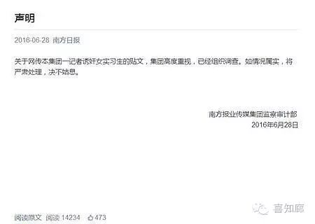 6月28日晚,南方日报在其官方微信公众号“南方日报”发出《声明》称:“关于网传本集团一记者女实习生的贴文,集团高度重视,已经组织调查。如情况属实,将严肃处理,绝不姑息。”