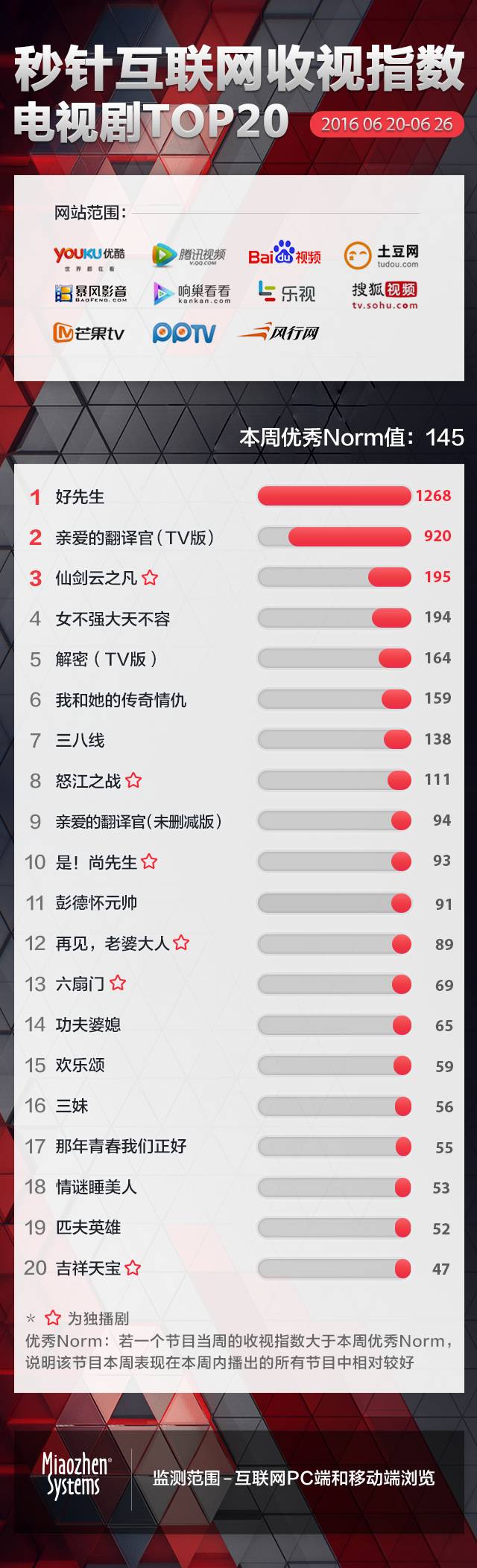 6月画上了句号。电视剧、综艺节目市场即将迈入暑期大战,在此之前,让我们来看一眼最新发布的“秒针互联网节目收视指数排名”吧:《好先生》不知不觉迎来大结局,收视爆表,反超《亲爱的翻译官》而位居榜首,都市题材火热依旧。