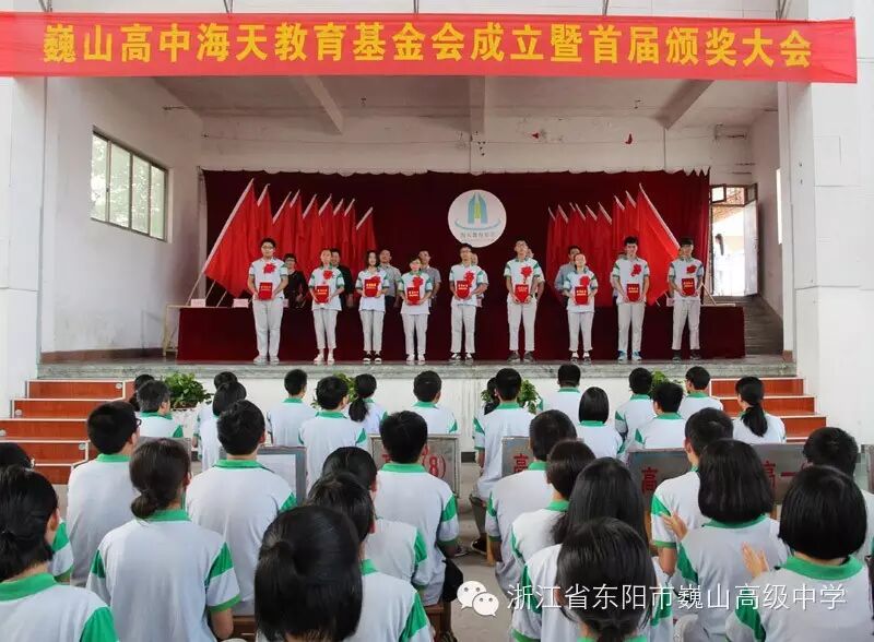9月24日下午,巍山高中隆重举行了海天教育基金成立暨首届颁奖大会。副市长蒋令树,海天建设集团董事长应培新、市教育局局长徐文金等领导出席。巍山高中海天教育基金由1966届校友、海天建设集团董事长应培新每年捐资30万设立的奖教、奖学基金,奖励巍山高中品学兼优的学生和教书育人业绩显著的教师。