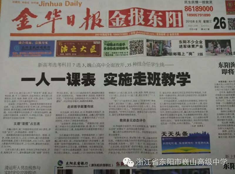 扎实稳妥地推进深化课改工作,建设具有学校特色的“立德 立功立言”三大板块课程群,被评为东阳市普通高中选修课程开发优胜单位。积极探索走班选课常态化、教师评价多元化、学生评价个性化、“四助课堂”模式化,切实推进学校特色化发展。《金报东阳》、《东阳电视台》、《东阳教育网》等媒体作了专题报道。12月1日市教育局教研室在我校召开了全市普通高中分类选课分层走班教学研讨会。