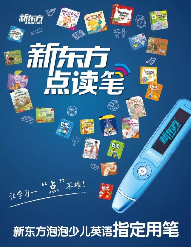 新东方点读笔是北京新东方大愚文化传播有限公司倾力打造的、采用最新光学图像识别技术的高科技产品。该产品具有发音标准、一笔多用、小巧便携、安全环保等特点,配套丰富,拥有持续更新的原声点读书资源,可配套点读新东方泡泡少儿英语系列培训教程、新东方满天星幼儿英语绘本全科教材、双语绘本、趣味英语读物及小语种等图书资源,是广大学生进行语言学习,家长进行家庭辅导,老师进行课堂教学的理想产品。