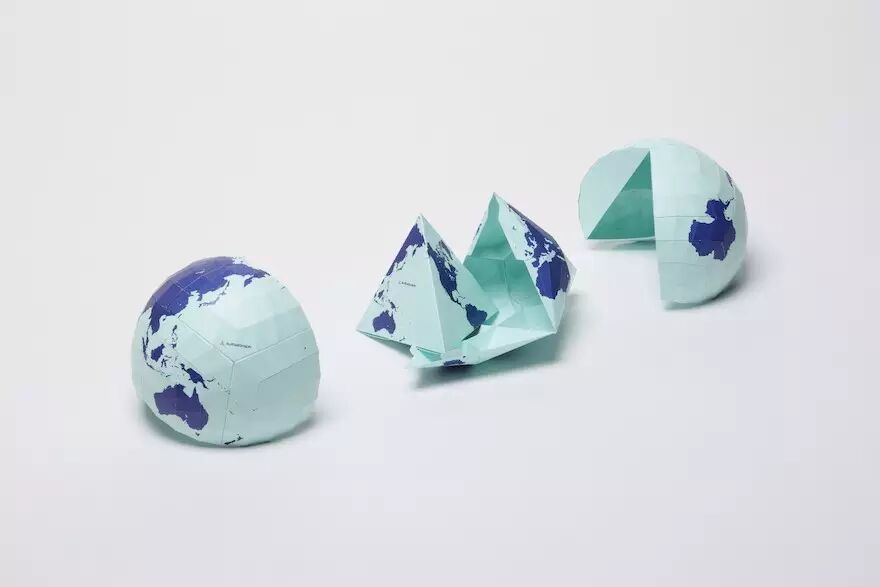 这个长方形模版可以移动至世界各地,以任何一个区域为中心,划定一个新的长方形,最终再折成一个选定视角下的三角锥体。这样做的好处在于,不仅可以准确展示海洋和陆地的面积比,还可以展现一个更为立体和多元化的世界。