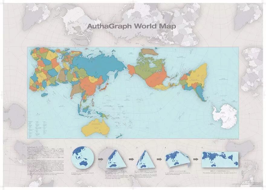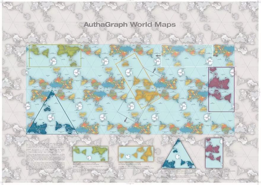 和我们常见的椭圆形世界地图不同,AuthaGraph世界地图呈长方形,是将地图的表面积做了96等分 ,将其变形为一个正三角锥体。
