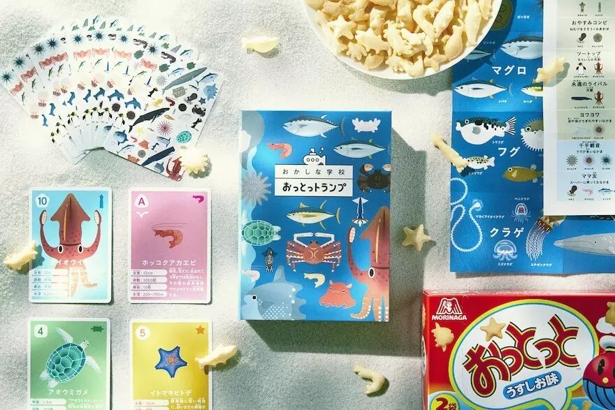 做成各种海洋生物状的小饼干是森永很受欢迎的经典产品,这次获奖的是这套带有海洋生物游戏纸牌的特别版小鱼饼干套装。