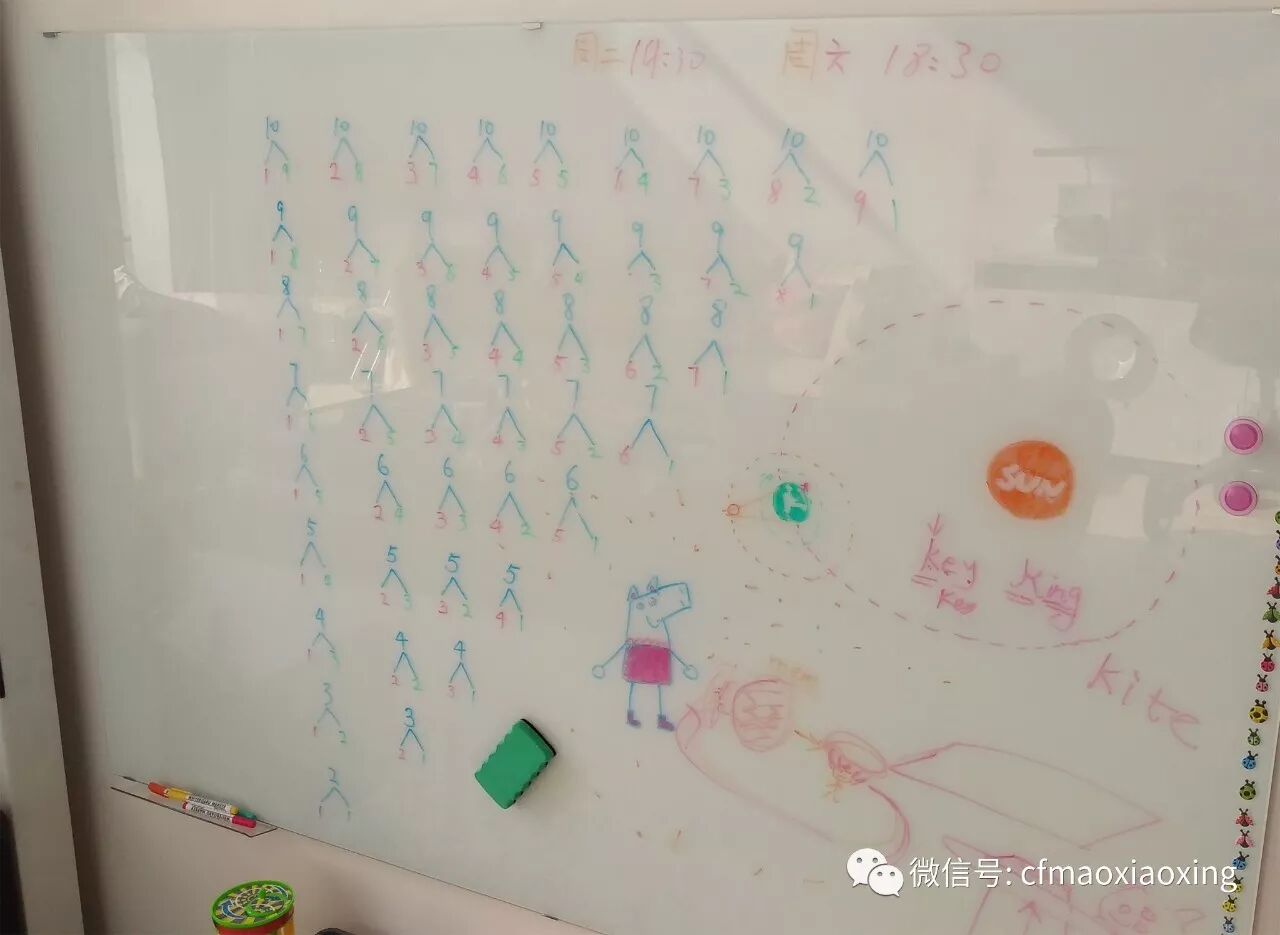 你可以看到上面有10以内的分解,有地球围绕太阳转的示意图,有Key、King、Kite这样的自然拼读,还有小孩随手画的涂鸦。。。